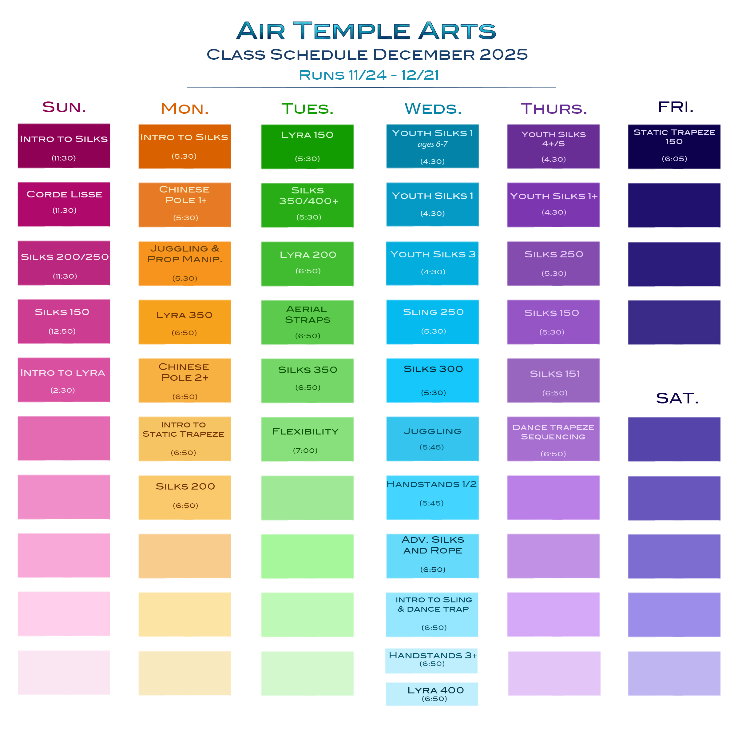 Class Schedule The schedule below (click to enlarge) outlines our weekly classes for our December session. Sign up online here. The schedule below (click to enlarge) outlines our weekly classes for our November session. Sign up online here.
