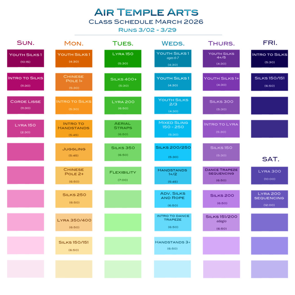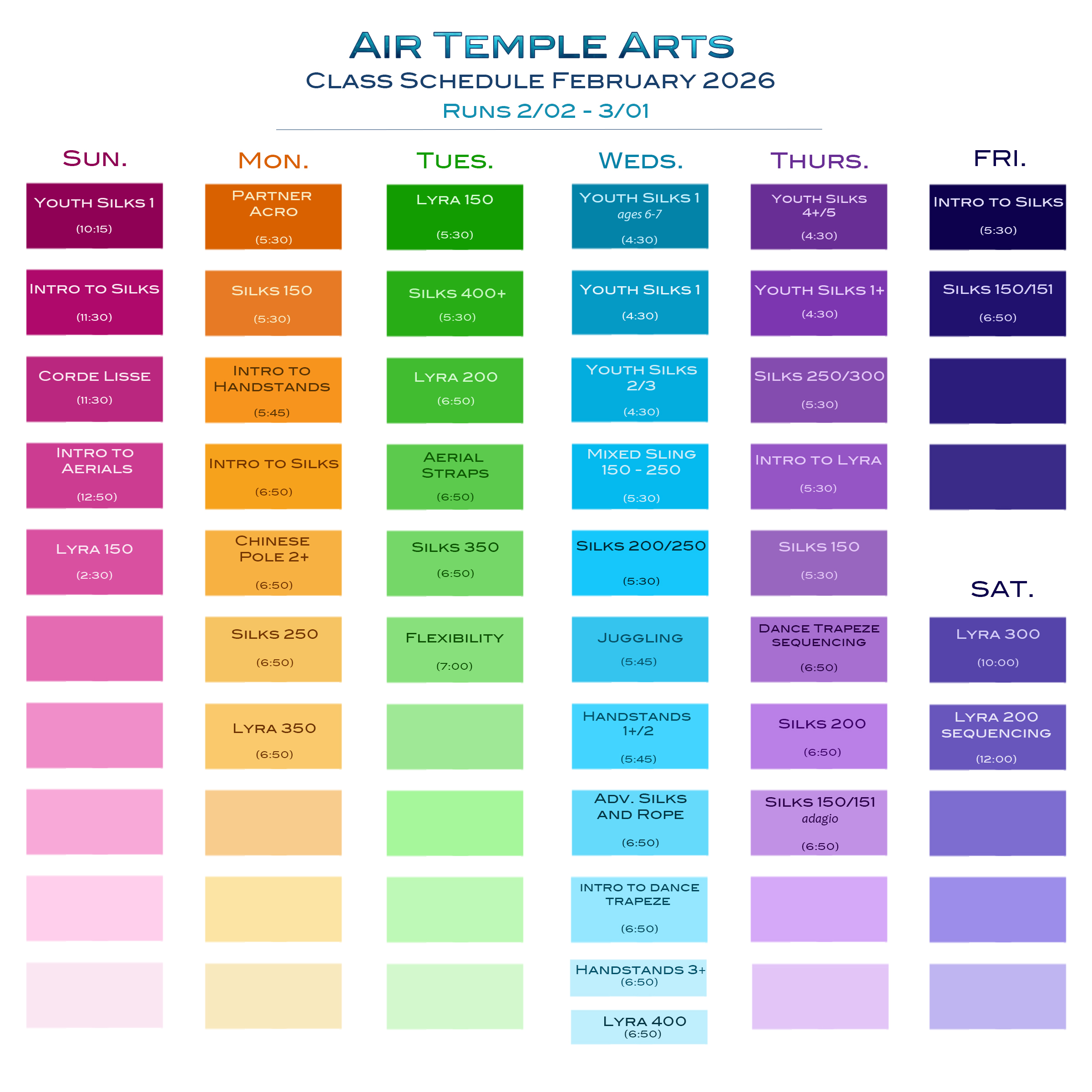 Class Schedule The schedule below (click to enlarge) outlines our weekly classes for our March session. Sign up online here. The schedule below (click to enlarge) outlines our weekly classes for our February session. Sign up online here.